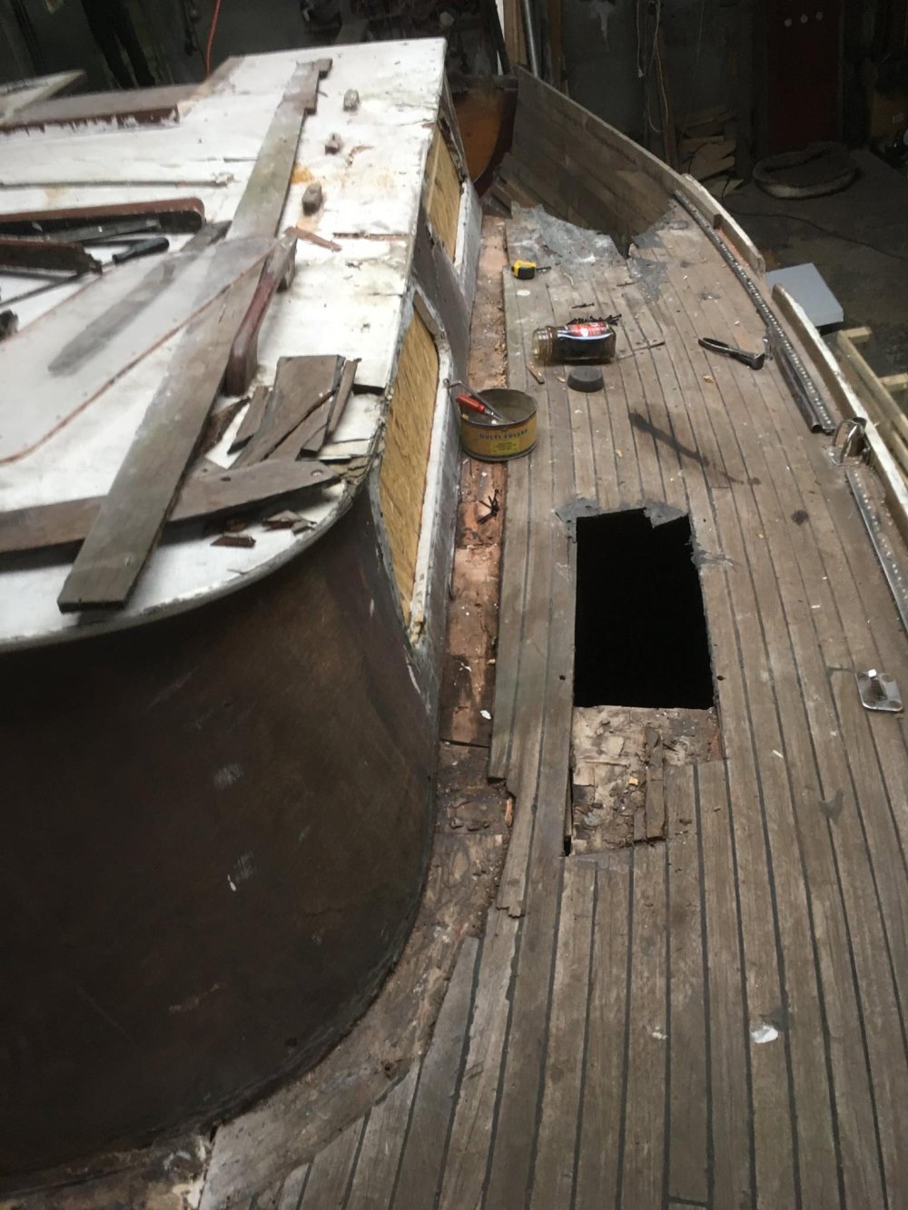 – W tej chwili oczyszczamy cały kadłub z zewnątrz, a wkrótce zrobimy badanie ultradźwiękowe, żeby sprawdzić, czy faktycznie nic nie zgniło – mówi żeglarz. – Zdemontowaliśmy też praktycznie całą zabudowę, żeby mieć dostęp do poszycia w środku. Jak oczyścimy kadłub, to w pierwszej kolejności odbudujemy grodzie w środku i uzupełnimy wszystkie ubytki w burtach. Potem czeka nas wymiana pokładu na nowy. Jak to zrobimy, to naprawimy ubytki w dnie, a następnie będziemy robić nową nadbudówkę.