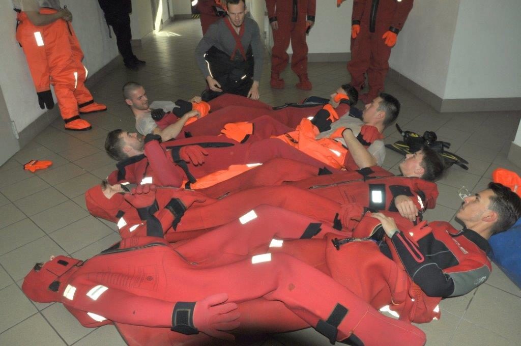Kolejny punkt to szatnia i sala treningowa. Każdy uczestnik, pod okiem instruktorów, otrzymał do założenia skafander piankowy i piankowy kombinezon ratowniczy. W niewygodnych (na lądzie) ubraniach, w kilkuosobowych zespołach, kursanci przećwiczyli procedury zachowań – łączenie się grupy, opieka nad słabszymi, lokowanie się w tratwie ratunkowej, których głównym celem była integracja zespołu, partnerska współpraca pomiędzy członkami w warunkach niebezpieczeństwa, komunikacja słowna i niewerbalna.