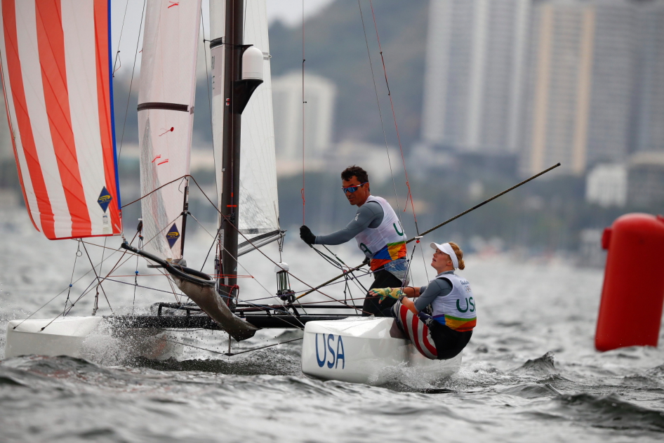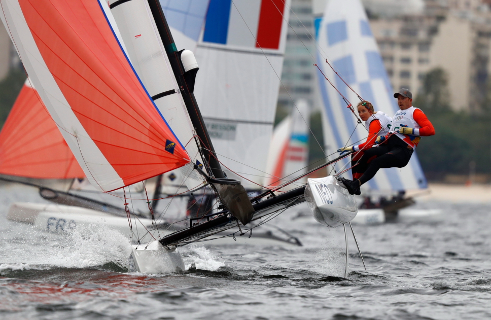 Szwajcarska para Mathias Buhler i Nathalie Brugger prowadzą po pierwszym dniu olimpijskiego debiutu klasy Nacra 17 w Rio de Janeiro. W środę, 10 sierpnia, udało się przeprowadzić dwa z trzech zaplanowanych na ten dzień wyścigów. Dziś mają zostać rozegrane trzy kolejne wyścigi.
