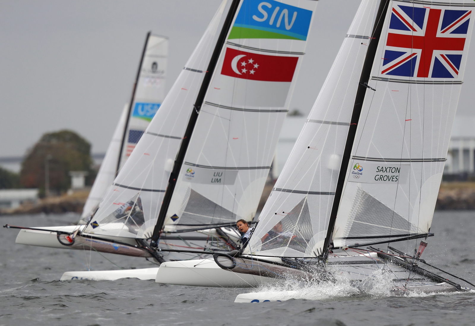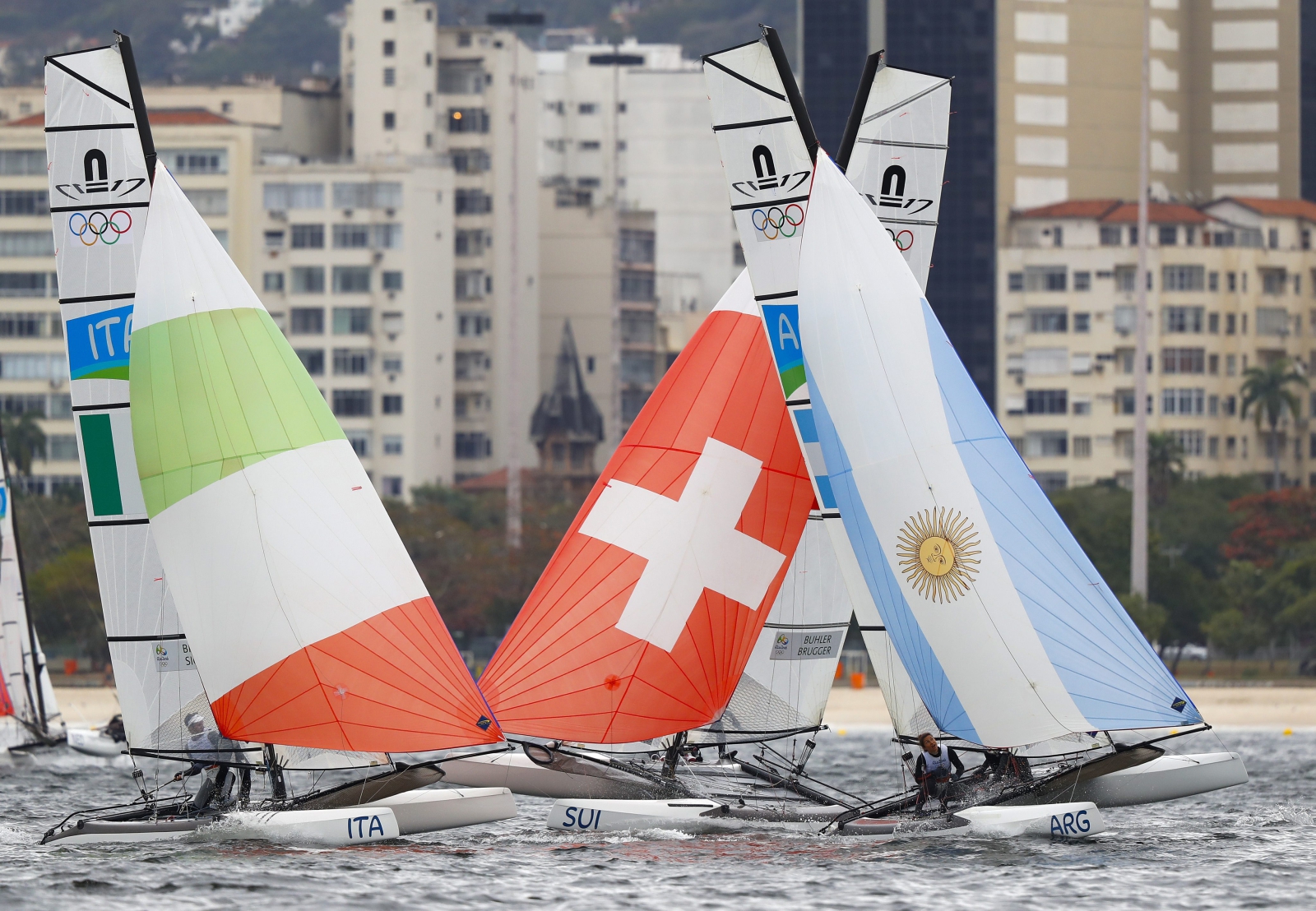 Warunki panujące na akwenie, na którym ścigały się załogi w klasie Nacra były bardzo trudnie. Ostatecznie zrezygnowano z przeprowadzenia trzeciego biegu. Szwajcarska para w pierwszym wyścigu zajęła pierwsze miejsce, a w drugim uplasowała się na siódmej pozycji. Z taką samą liczbą punktów na drugiej pozycji znaleźli się Ben Saxton i Nicola Groves z Wielkiej Brytanii (3, 5). Trzecią załogą jest argentyński duet Santiago Lange i Cecilia Carranza Saroli (11, 2).