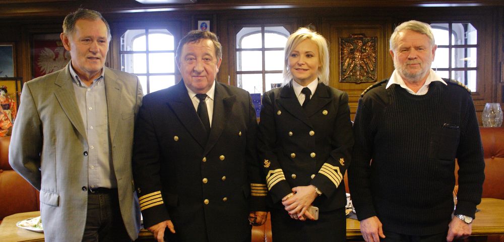 Na konferencji prasowej zapowiadającej plany „Daru Młodzieży”, od lewej: Aleksander Gosk z działu armatorskiego, prorektor ds. morskich Henryk Śniegocki, Katarzyna Muszyńska, kierownik działu armatorskiego i komendant „Daru Młodzieży” Ireneusz Lewandowski.