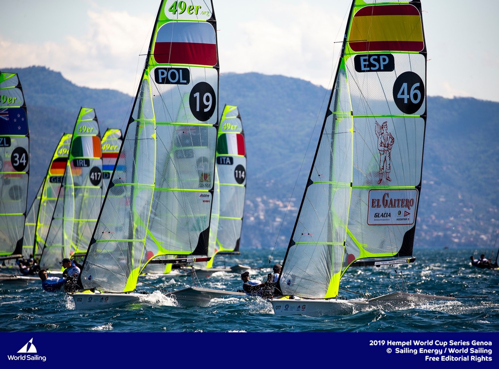 W klasie 49er udało się przeprowadzić dwa wyścigi i miejsca dziesiąte oraz jedenaste zajęli w nich Łukasz Przybytek i Paweł Kołodziński (AZS AWFiS Gdańsk), co daje im na razie jedenastą pozycję w klasyfikacji generalnej. Z kolei wicemistrzowie Europy Dominik Buksak i Szymon Wierzbicki (AZS AWFiS Gdańsk/AZS Poznań) mijali linie mety na miejscach jedenastym oraz siedemnastym w swojej grupie i zajmują dwudziestą dziewiątą lokatę. Prowadzą brązowi medaliści zeszłorocznych mistrzostw świata, Niemcy Tim Fischer i Fabian Graf (miejsca 1 i 1). W żeńskim odpowiedniku, czyli w klasie 49erFX, z powodu kontuzji nie pojawiły się na wodzie Aleksandra Melzacka i Kinga Łoboda (YKP Gdynia/AZS AWFiS Gdańsk).