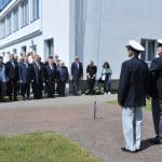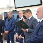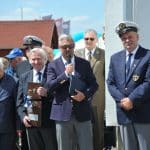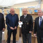Prezes PoZŻ i wiceprezes PZŻ Bogusław Witkowski (pierwszy z lewej) i prezes PZŻ Tomasz Chamera przekazali pamiątkowy dzwon na ręce komandora ChKŻ Krzysztofa Pestki (pierwszy z prawej).