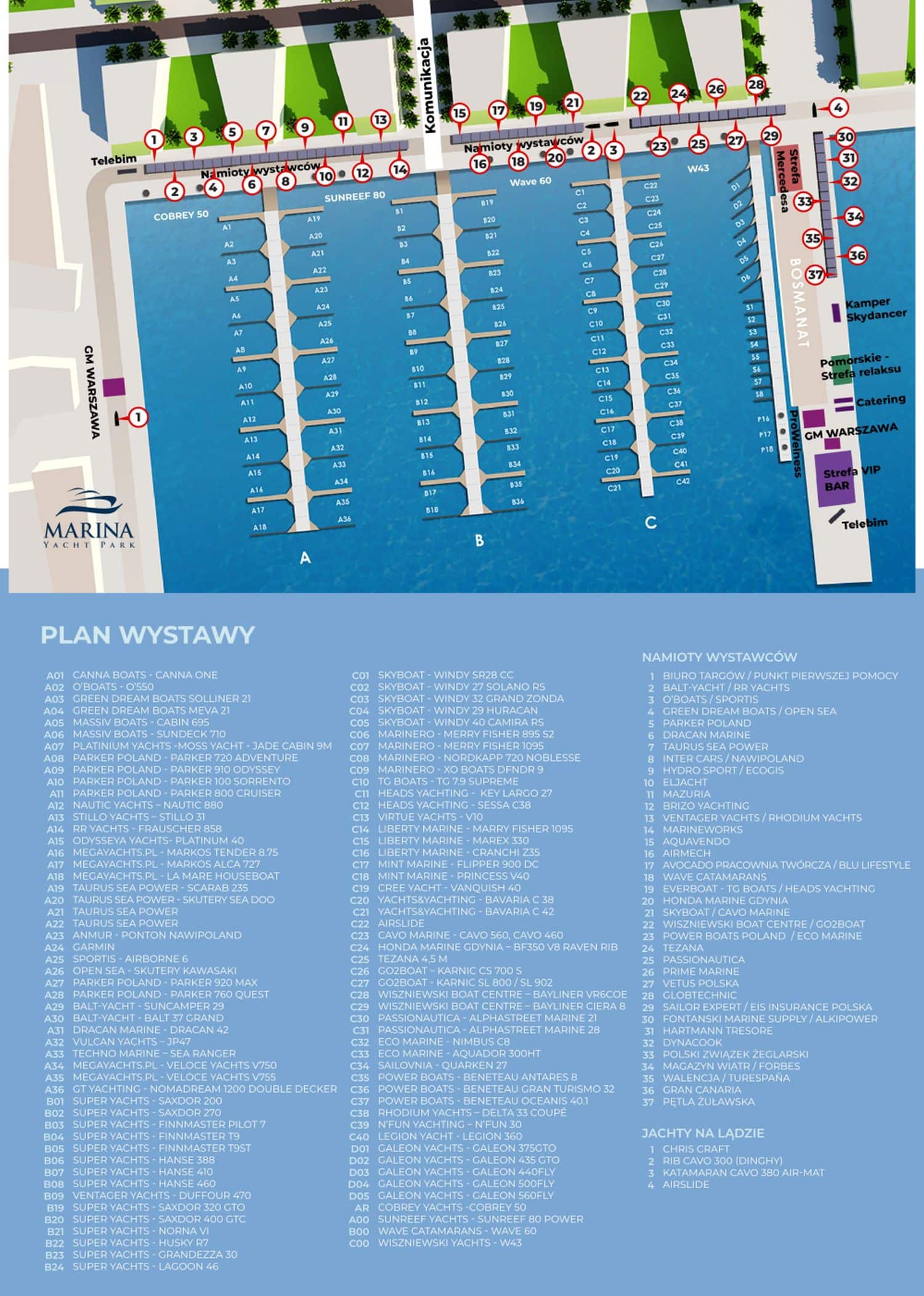 Poza tym na wystawie zobaczymy innych polskich producentów Canna Boats, Stillo Yachts, Green Dream Boats, Techno Marine, o’Boats, Massiv Boats, Markos a także debiutujące na gdyńskiej Wystawie – Veloce Yachts, Dracan Marine, NawiPoland i Virtue Yachts. Dodatkowo z polskich stoczni zaprezentowane będą jachty żaglowe N’Fun30 i Legion 360, łodzie wypornościowe od Balt-Yacht – Balt 37 Grand i SunCamper 29 (światowa premiera), riby Sportis i Cavo Marine, houseboaty La Mare i Nomadream a także niezwykle ciekawie zapowiadający się katamaran z silnikami zaburtowymi Dracan 42 (światowa premiera).