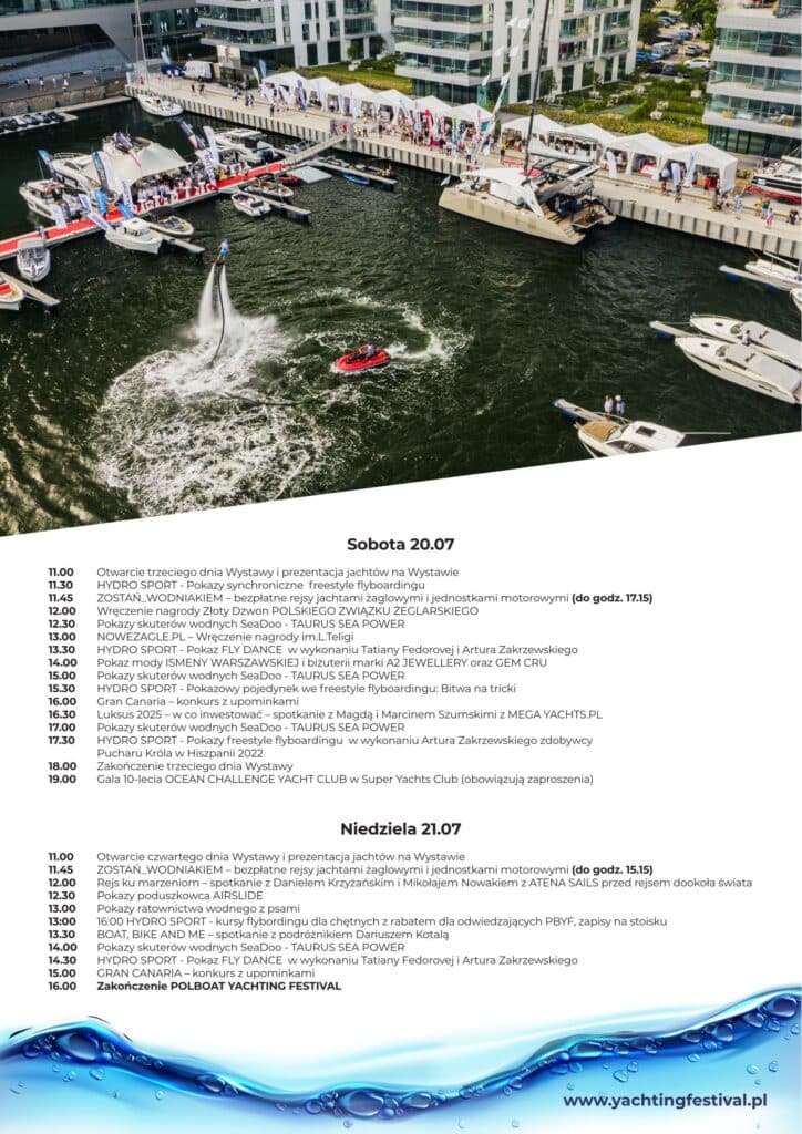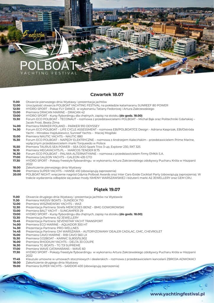 Największe targi jachtowe na wodzie w tej części Europy odbędą się już w dniach 18-21 lipca w Marinie Yacht Park w Gdyni. Piąta edycja Polboat Yachting Festival będzie bez wątpienia wyjątkowa, rekordowa pod względem prezentowanych jednostek, obfitująca w premiery, pokazy sportów wodnych i spotkania z ciekawymi gośćmi. W tym roku, oprócz firm znanych z poprzednich edycji, pojawi się wielu nowych wystawców, a motywem przewodnim będzie zrównoważony rozwój. Wstęp wolny.