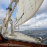 – Ożaglowanie to kecz z klasycznym grotem i bezanem stawianym bez użycia rolerów i innych patentów, bo to się nie sprawdza w warunkach dużego zimna i oblodzenia. To jest dobre na żeglarstwo turystyczne, chorwackie, a nie na dłuższe wyprawy w trudniejsze rejony. Na przodzie jest duża genua i mniejszy fok na bomie, czyli bardziej to sztafok. Testowaliśmy takie rozwiązanie niedawno dzięki temu żagiel mniej łopocze, jest bardziej stabilny. W ciężkich warunkach łódka może doskonale żeglować.