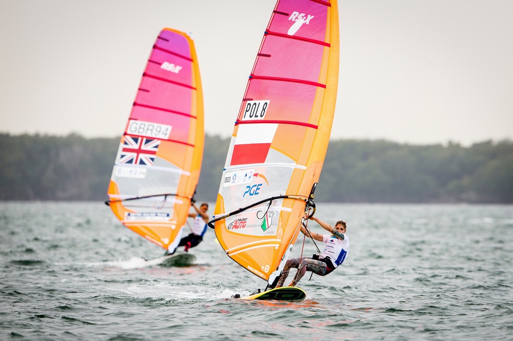 W windsurfingowej klasie RS:X odbył się jeden wyścig i świetnie popłynęła w nim aktualna mistrzyni Europy Zofia Klepacka (Legia Warszawa), mijając linię mety jako pierwsza. Dzięki temu Polka awansowała z pozycji ósmej na drugą i do prowadzącej, brązowej medalistki zeszłorocznych mistrzostw świata Chinki Yunxiu Lu, traci pięć punktów. Trzecia jest Włoszka Flavia Tartaglini.