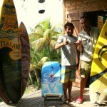 – Do nauki najlepsza byłaby długa deska, ale po pierwsze nie mam żadnej na sprzedaż, a po drugie jeśli się już czegoś nauczysz, to szybko będziesz chciał się przesiąść na krótką. Tutaj mam dwie mniejsze deski, które mogą być dla ciebie trochę trudne, ale za to starczą ci na dłużej. Ta biała jest lokalnej produkcji. Specjalny kształt na niskie i krótkie fale, ale trochę delikatna. Żółta jest mocna. Epoksyd. Klasyczny kształt, nadaje się na duże fale ale trzeba się na niej sporo namachać rękami.