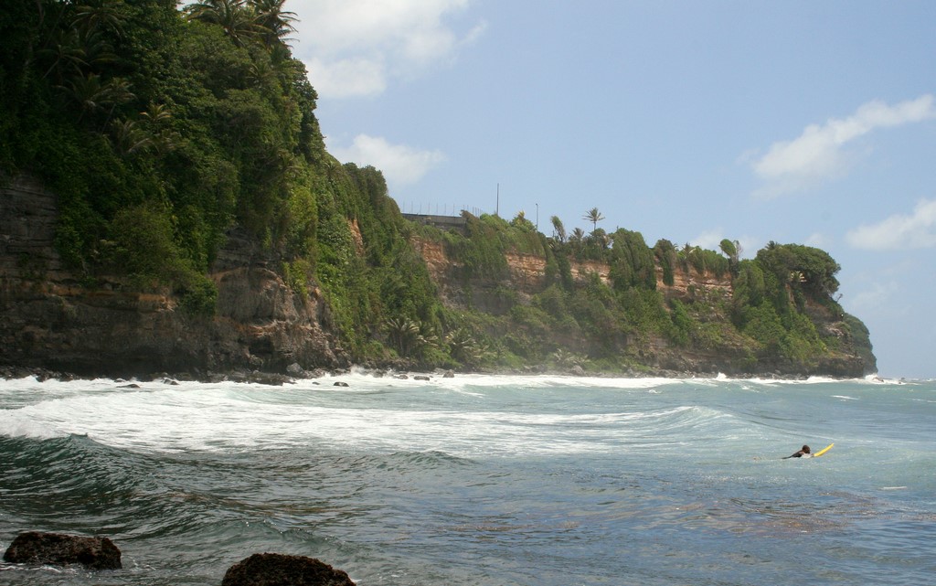 Na Basse-Pointe byłem już wcześniej w ramach rozeznania i szczerze mówiąc od początku zastanawiałem się jak można tam w ogóle surfować? W miarę dobra atlantycka fala wpadająca na krótkie wypłycenie rozbija się tu dokładnie u stóp pionowego, bazaltowego klifu. Plaża obok to stromo opadający brzeg, w stu procentach zarzucony półmetrowymi i metrowymi kamieniami, a jedyne łagodne zejście do wody to rybacki slip schowany tuż na falochronem zbudowanym z wielkich głazów, na których przenigdy nie chciałbym wylądować.