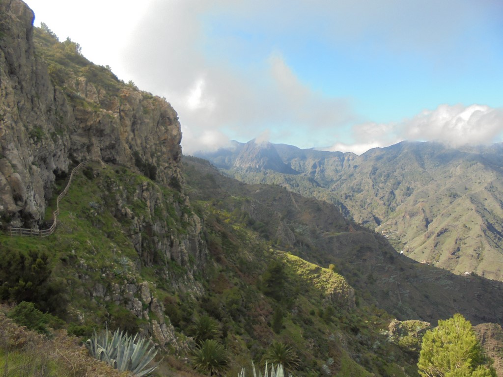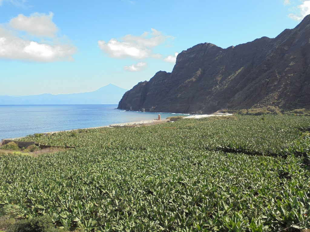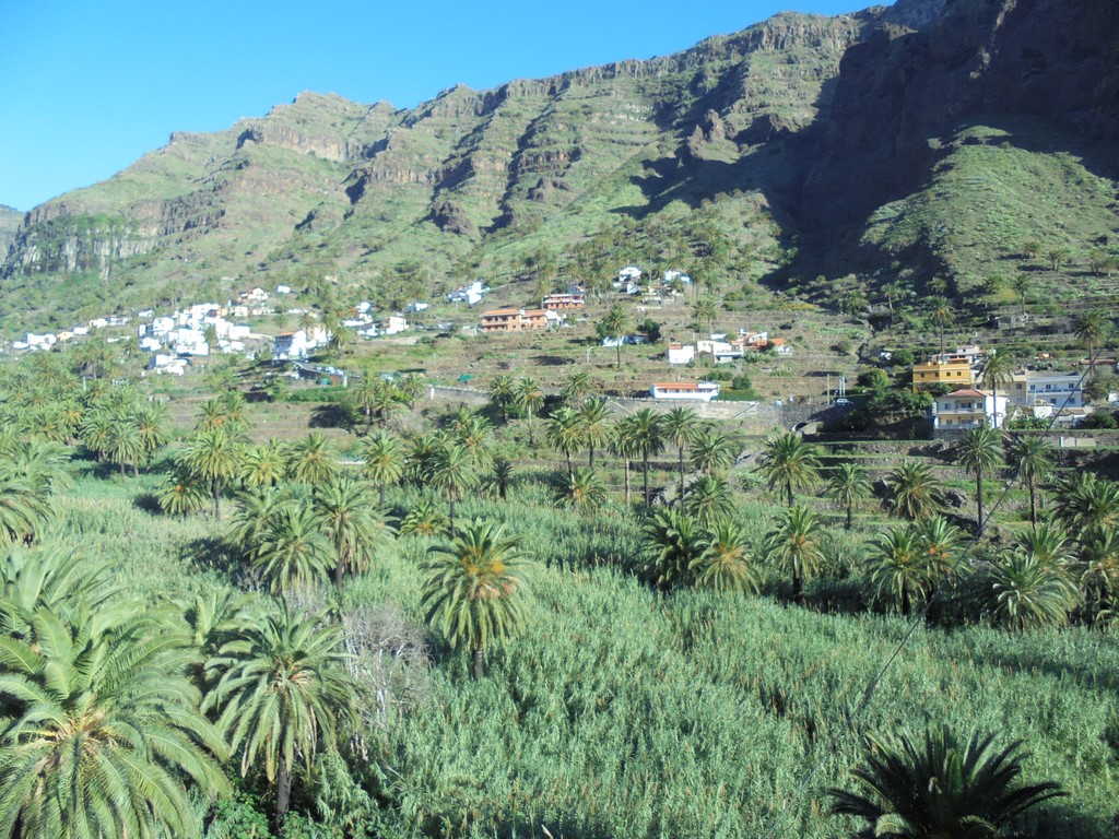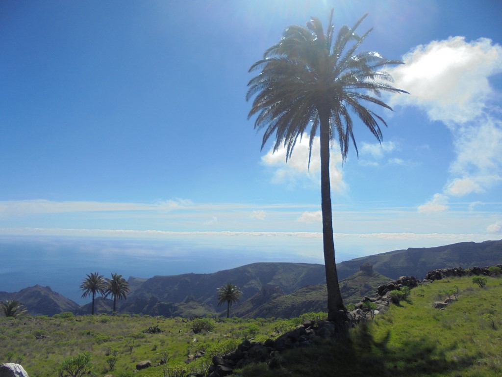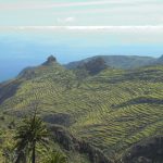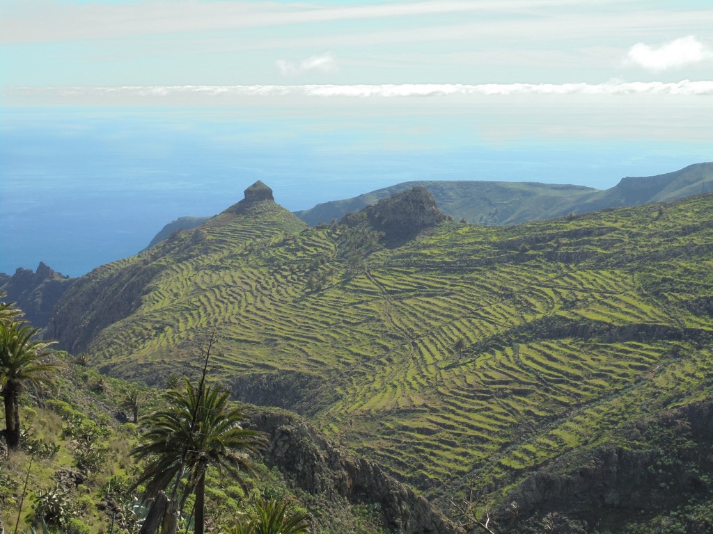 Wśród takiego towarzystwa okrągła Gomera tkwi spokojnie na uboczu, porastana prehistorycznym lasem laurowo-wrzosowym, kruszącym korzeniami korony wygasłych wulkanów, których wierzchołki znikają często wśród kłębów życiodajnych chmur. Wspinając się po kamiennych ścieżkach ułożonych dawno temu przez rodowitych Guanczów, przechodzi się najpierw wśród zboczy pokrytych zielonymi tarasami. Łatwo dostępne partie pól położone w dolinach, po dzień dzisiejszy użytkowane są pod uprawy bananów i innych owoców tropikalnych, ale mniejsze i trudniejsze w uprawie poletka zostały porzucone kilkadziesiąt lat temu i dziś są powoli zarastane przez majestatyczne palmy i smocze drzewka.