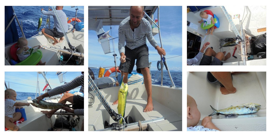 Żyłka zwijała się bez większego oporu. Tym większe było moje zaskoczenie, kiedy tuż za rufą jachtu rozpoznałem jak najbardziej prawdziwą, ok. 3 kilogramową koryfenę! Jeszcze większe było zaskoczenie małego Bruna, który w tym samym czasie oglądał sobie w kokpicie książeczkę z obrazkami i nie spodziewał się zupełnie takiego obrotu sprawy.