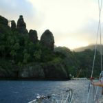 Trzydziestego trzeciego dnia żeglugi na horyzoncie pokazała się masywna sylwetka Fatu Hivy ginąca częściowo w ciężkich, deszczowych chmurach zaczepionych o ostre zęby jej szczytów. Do Zatoki Dziewic dotarliśmy już po zachodzie słońca i smagani sztormowymi szkwałami spadającymi na nas ze stromych zboczy cudem odnaleźliśmy ostatnie wolne miejsce na niewielkim i pełnym już kotwicowisku. Kotwica i sześćdziesiąt metrów łańcucha poszły w dół, by na kilka dni uczepić się dna i unieruchomić zmęczonego długą drogą Sputnika III. Wśród przeraźliwych gwizdów wiatru otworzyliśmy schowaną na tą okazję butelkę wina i przy świetle księżyca wypiliśmy pierwszy toast za szczęśliwą podróż, oraz kolejny z okazji 37 urodzin kapitana. Wdychając kwiatowy zapach niesiony od lądu, z niecierpliwością czekaliśmy świtu i tego co przyniesie nam pierwszy dzień na Markizach.