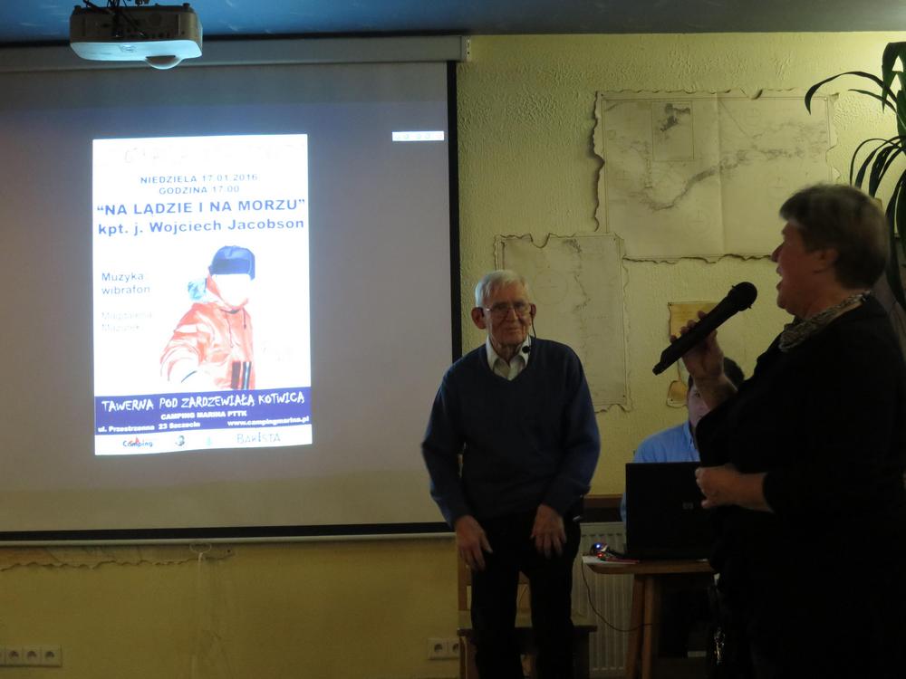 Sala klubowa dosłownie pękała w szwach, wypełniona przez przyjaciół i znajomych j. kpt. ż.w. Wojtka Jacobsona, jednego z najbardziej opływanych polskich kapitanów jachtowych, z dorobkiem blisko 250 tys. mil morskich. Wojtek żegluje od ponad 65 lat (!), niedawno w tej samej Tawernie uhonorowany razem z innymi listem gratulacyjnym z okazji 50-lecia kapitaństwa, a przy tym nie ma swojego jachtu!