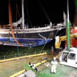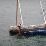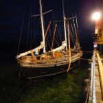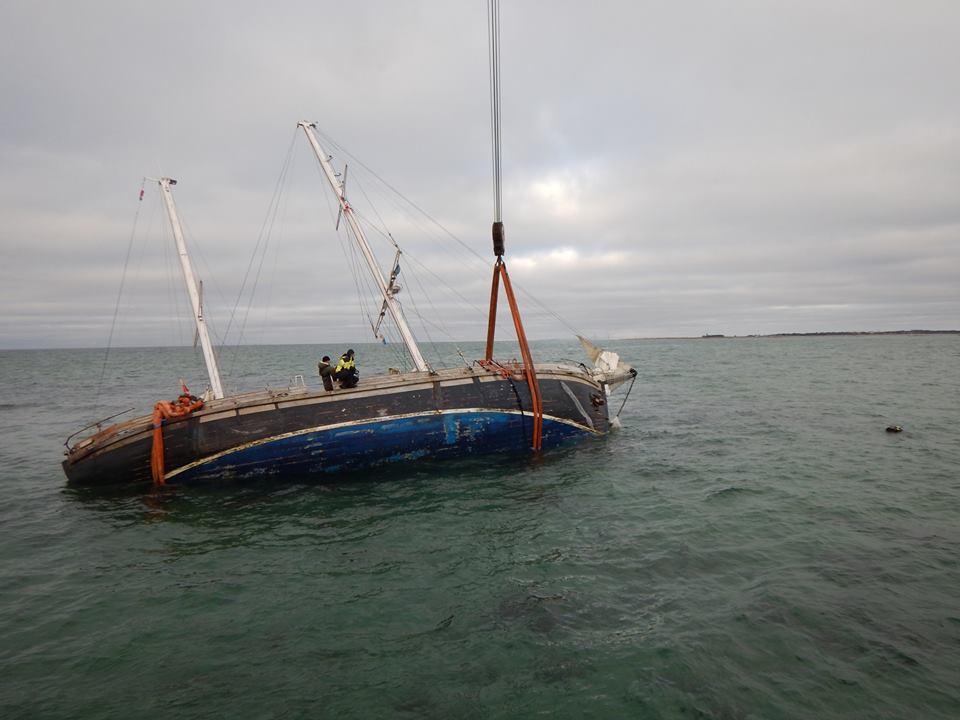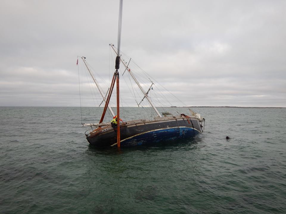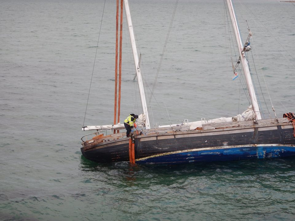 3. Stabilizacja jachtu. Zjawa stała prawą burta do SP, ale leżąc na lewej burcie. Założono więc linę, zaczepiając ją za maszt, następnie lina szła przez prawa burtę, pod kilem i do góry, przez lewą burtę do dźwigu. Dźwig ciągnąc linę prostował jacht, aż ten stanął prawie na stępce, z lekkim przechyłem na lewą burtę. W tej pozycji mieliśmy odpompować z jachtu wodę (…).