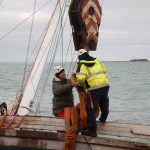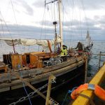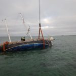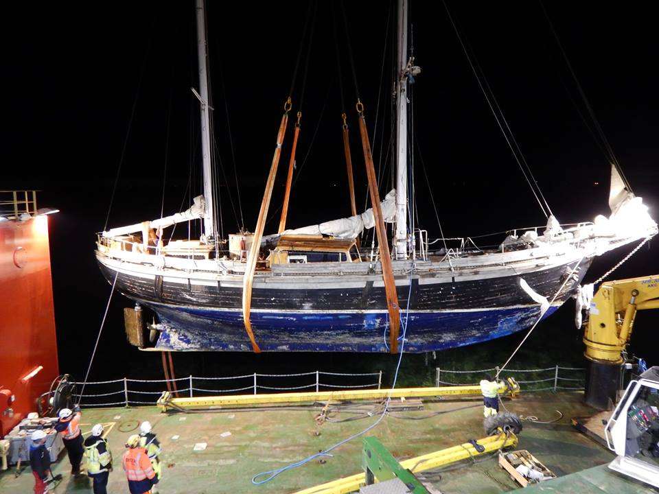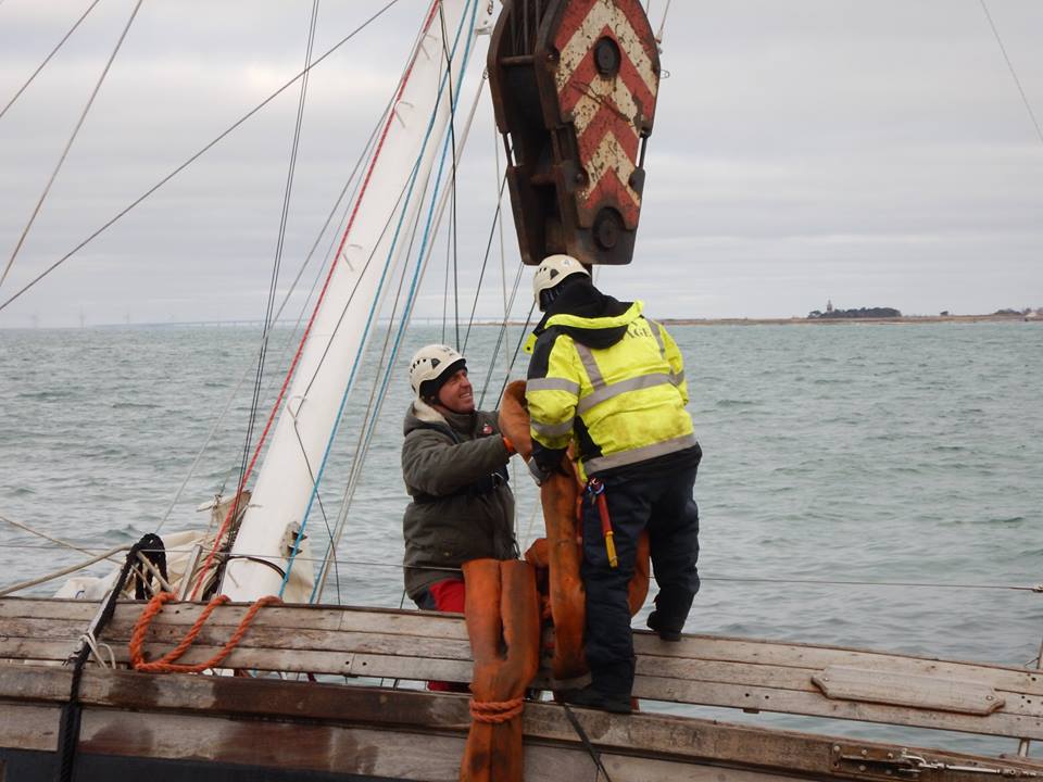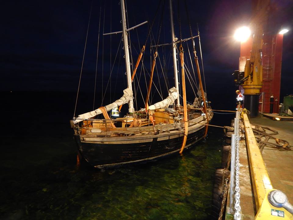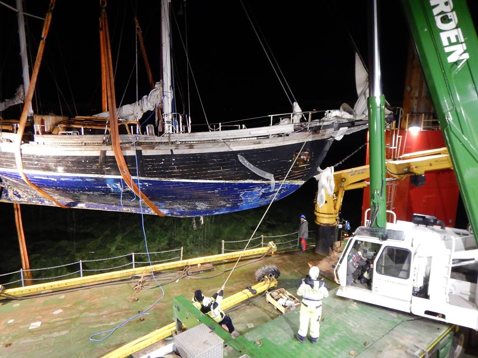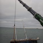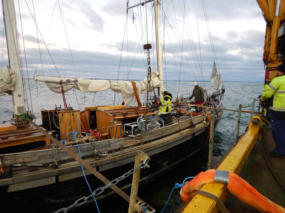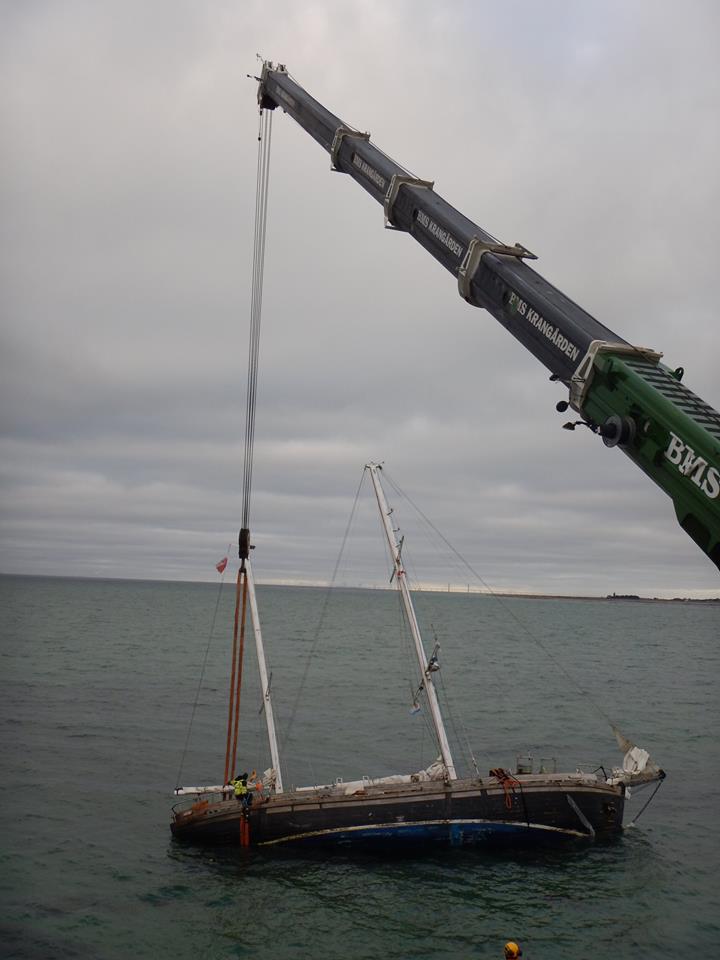 5. Przeniesienie na pokład Sound Prospectora. Po odklejeniu się jachtu od wody, pozostało tylko jacht odpowiednio obrócić i ułożyć na prowizorycznym łożu.