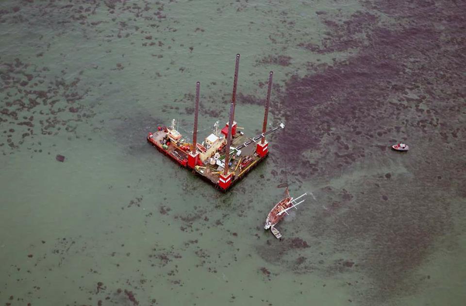 2. Przysunięcie Zjawy do burty Sound Horizon. Robiono to w ten sposób, że zaczepiano rufę do dźwigu i unoszono. Jacht opierał się na dziobnicy, przesuwano rufę do burty. Następnie podobnie postępowano z dziobem. I tak pięć razy. W końcu Zjawa znalazła się 3 m od burty Sound Prospector i 9 m od dźwigu. Salvage master uznał, że to wystarczy (pomiary przeprowadzano miernikiem laserowym).