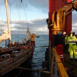 1. Przejście Sound Horizon do Sound Prospector i ustawienie go jak najbliżej Zjawy. To zadanie prawie się powiodło. Sprzyjała nam pogoda i wyższy o 47 cm niż zazwyczaj, poziom wody w tym rejonie. Niemniej Sound Prospector, pchany przez Sound Horizon zatrzymał się 21 metrów od Zjawy. Zbyt daleko, by ramię dźwigu mogło unieść 60 tonowy jacht. Dlatego zaczęła się druga faza: